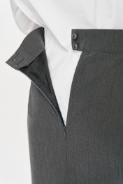 Юбка облегающая бедра, зауженная к низу, длиной макси. По передней половине юбки выполнены складки и левой стороны вертикальный шов, в нижней части которого обработан разрез. Задняя часть юбки с талиевыми вытачками и вертикальным средним швом в верхней части которого обработана потайная молния. Юбка на притачном поясе с эластичной тесьмой по задней части пояса и застежкой на петлю и пуговицу. По передней правой части пояса обработан декоративный элемент в виде свободно падающего хвоста. По передней левой части юбки обработана петля для хвоста.
