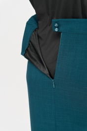 Юбка облегающая бедра, зауженная к низу, длиной макси. По передней половине юбки выполнены складки и левой стороны вертикальный шов, в нижней части которого обработан разрез. Задняя часть юбки с талиевыми вытачками и вертикальным средним швом в верхней части которого обработана потайная молния. Юбка на притачном поясе с эластичной тесьмой по задней части пояса и застежкой на петлю и пуговицу. По передней правой части пояса обработан декоративный элемент в виде свободно падающего хвоста. По передней левой части юбки обработана петля для хвоста.