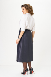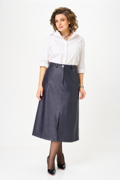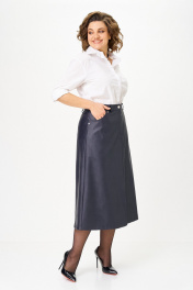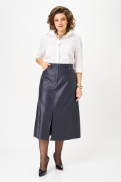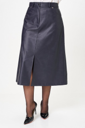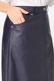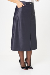 Юбка А-образного силуэта, длиной ниже колена, выполнена из экокожи. Юбка на подкладке. Передняя часть юбки с центральным швом в верхней части которого обработана застежка на молнию, в нижней части разрез. В верхней части передней половины обработаны обтачные фигурные карманы. Задняя часть юбки цельная, с талиевыми вытачками. По талии юбка на притачном поясе с застежкой спереди на петлю и пуговицу. По задней части пояса между вытачками обработана эластичная тесьма. На поясе обработаны шлевки для ремня