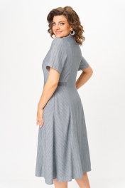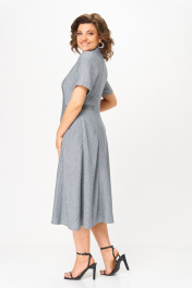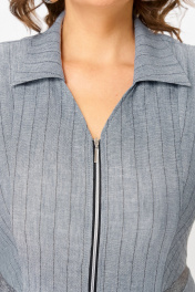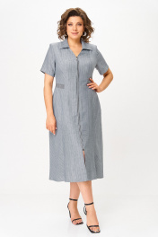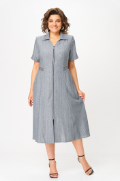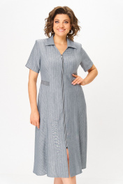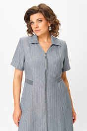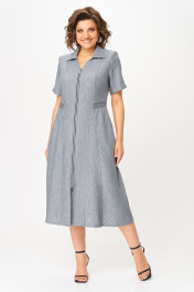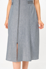 Платье А-силуэта, выполнено из ткани в полоску. Полочка платья с центральной застежкой на молнию и вертикальными рельефами. Горловина V-образной формы с отложным воротником. Спинка с вертикальными рельефами. В области талии от рельефа спинки до рельефа полки обработан пояс-резинка из трикотажного полотна. В боковом шве обработаны карманы. Рукав втачной, одношовный, короткий. Платье длиной за колено, платье на плечиках.