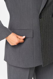 Жакет полуприлегающего силуэта, на подкладке, выполнен из костюмной однотонной ткани, в качестве отделки использована костюмная ткань в полоску. Полочка жакета с двубортной застежкой-трансформер на петли и пуговицы, вертикальными рельефами и прорезным карманом с клапаном. Левая полочка и лацкан правой полочки выполнены из отделочной ткани в полоску. Горловина V-образной формы, с отложными лацканами и воротником пиджачного типа. Спинка со средним швом и вертикальными рельефами. Рукав длинный, двухшовный, втачной.