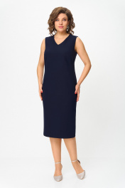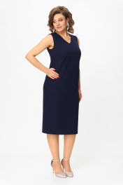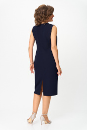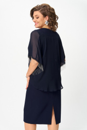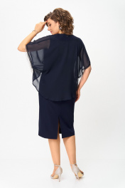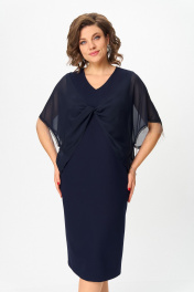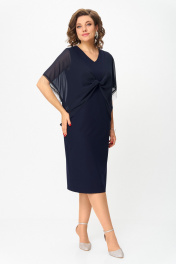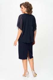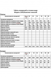 Платье полуприлегающего силуэта, двухслойное выполнено из однотонной ткани, в качестве отделки использован шифон. Платье длиной за колено. Полочка платья с нагрудными вытачками. Горловина полочки V-образной формы. Спинка платья со средним швом, в верхней части которого обработана потайная молния, в нижней части разрез. Платье без рукавов. Верхняя часть платья сьемная, выполнена из шифона. Полочка с конструктивным элементом в виде узла и V-образной горловиной. Спинка цельная. Линия плеча удлененная, образующая цельнокроеный рукав, длиной до локтя. Пройма обработана декоративной тесьмой.