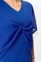 Платье полуприлегающего силуэта, двухслойное выполнено из однотонной ткани, в качестве отделки использован шифон. Платье длиной за колено. Полочка платья с нагрудными вытачками. Горловина полочки V-образной формы. Спинка платья со средним швом, в верхней части которого обработана потайная молния, в нижней части разрез. Платье без рукавов. Верхняя часть платья сьемная, выполнена из шифона. Полочка с конструктивным элементом в виде узла и V-образной горловиной. Спинка цельная. Линия плеча удлененная, образующая цельнокроеный рукав, длиной до локтя. Пройма обработана декоративной тесьмой.