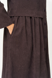 Платье прямого силуэта, длиной за колено, выполнено из вельвета в мелкий рубчик. Полочка платья с отрезной планкой по центру и застежкой на петли и пуговицы. Лиф платья отрезной , со складкой по низу, к срезу которой притачана юбка со сборкой. Полочка лифа с нагрудными вытачками и накладными карманами. Горловина круглой формы обработана воротником-стойкой. Пройма углубленной формы с рукавом рубашечного типа, рукав длинный, одношовный. В боковых швах юбки обработаны карманы.