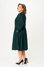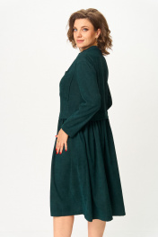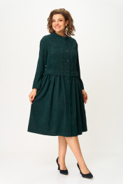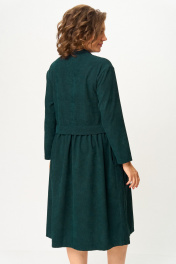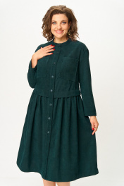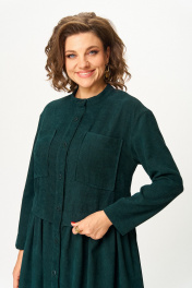 Платье прямого силуэта, длиной за колено, выполнено из вельвета в мелкий рубчик. Полочка платья с отрезной планкой по центру и застежкой на петли и пуговицы. Лиф платья отрезной , со складкой по низу, к срезу которой притачана юбка со сборкой. Полочка лифа с нагрудными вытачками и накладными карманами. Горловина круглой формы обработана воротником-стойкой. Пройма углубленной формы с рукавом рубашечного типа, рукав длинный, одношовный. В боковых швах юбки обработаны карманы.