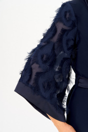 Костюм состоящий из жакета и брюк выполнен из однотонной ткани, в качестве отделки использован шифон с обьемным жаккардовым рисунком и однотонный атлас в цвет основной костюмной ткани. Жакет прямого силуэта, облегченный вариант без подкладки. Полочка жакета с застежкой на две петли и пуговицы, с вертикальными рельефами и прорезными карманами. Горловина V-образной формы с отложными лацканами и воротником пиджачного типа. Спинка со средним швом. В области талии по боковым швам настрочены шлевки через которые продет пояс, завязывающийся спереди. Рукав одношовный, длиной 3/4, расширенный книзу. Низ рукава обработан притачной планкой. Брюки классические, со стрелками, полной длины, выполнены из однотонной ткани. В области бедер полуприлегающие, в колене и по низу прямые. По передним половинкам обработаны складки по линии талии и наклонные карманы, в среднем шве застежка на молнию. По задним половинкам обработаны талиевые вытачки. Брюки на притачном поясе с эластичной тесьмой и застежкой на петлю и пуговицу.
