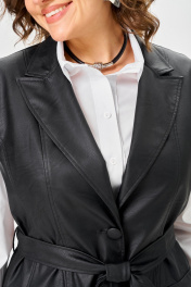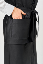 Жилет прямого силуэта, выполнен из экокожи. Жилет на подкладке. Полочка жилета с вертикальными рельефами и застежкой на петли и пуговицы. В нижней части полочки обработаны накладные карманы с клапанами. Спинка со средним швом. Горловина V-образной формы с отложными лацканами и воротником пиджачного типа. Плечевой шов удлиненный. По боковым швам в области талии настрочены шлевки, через которые продет пояс, завязывающийся спереди.