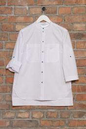 Блузка женская из хлопковой ткани, прямого покроя, воротник-стойка, на полочке настрочные нагрудные карманы,с застёжкой на петли пуговицы, с притачными рукавами 7/8 с притачными манжетами с патами регулирующие длину рукава застёгивающиеся на петлю и пуговицу, спинка с дизайнерским принтом на спинке. спинка с притачной горизонтальной кокеткой. Длина по спинке 76см, грудь 46-48-50рр=108-112-116см, бедра 46-48-50рр=112-116-120см, длина рукава 49 см.