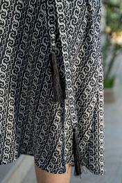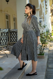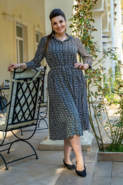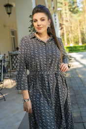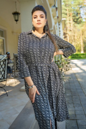 Платье женское полурилегающего силуэта с центральной бортовой застёжкой на петли и пуговицы, воротник стояче-отложной, застегивающийся на петлю и пуговицу. Платье с втачными рукавами 7/8, застёгивающиеся на три петли и пуговицы. По полочке обработан пояс завязка. По спинке по линиии талии обработан хлястик.