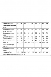 Костюм женский, состоящий из брюк и блузки. Блузка женская прямого силуэта со спущенным плечом, с круглым вырезом горловины, с низом фигурной формы. Перед с накладным нагрудным карманом. Спинка с кокеткой с застежкой сверху на пуговицу, нижняя часть спинки состоит из двух частей, с запа́хом. Брюки женские свободного кроя, прямые, на притачном поясе со шлевками спереди и эластичной тесьмой сзади. Передние половинки с двумя наклонными боковыми карманами. Пояс с завязками