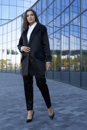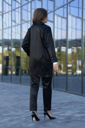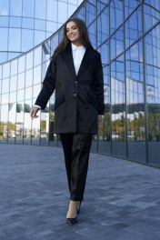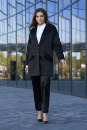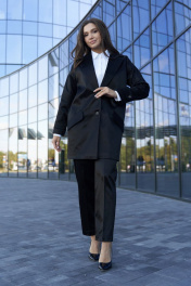 Костюм женский двойка, состоящий из удлиненного жакета и брюк, выполнен из смесовой хлопчатобумажной ткани. Жакет прямого силуэта, с застежкой на петли и пуговицы, воротник пиджачного типа. По переду обработаны карманы с клапаном в швах, спинка со средним швом. Рукава втачные одношовные на спущенной пройме, но низу рукава паты, застегивающиеся на петлю и пуговицу. Изделие на подкладке. Брюки классические полуприлегающего силуэта с боковыми карманами спереди. Застежка брюк на тесьму молнию спереди и петлю и пуговицу по поясу. Пояс с эластичной резинкой сзади.