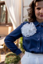 Комплект женский двухпредметный, состоит из джинсовой блузки и юбки. Джинсовая рубашка – это стильный и практичный элемент гардероба, который никогда не выходит из моды. Рубашка прямого покроя с длинными рукавами с манжетами и накладным карманом спереди. Юбка классического кроя, прямая, длины миди с застёжкой и шлицей спереди. В комплекте дизайнерская брошь “цветок” ручной работы.