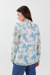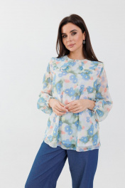 Блуза женская, свободного кроя, длина до середины бедра. На подкладке. Рукав втачной, длинный, на запястье на резинке. Горловина обработана отложным воротником с рюшей. Замеры: Размер 46: ОГ 100, ОТ 107, ОБ 112, ДИ 70,5, ДР 62 Размер 48: ОГ 104, ОТ 110, ОБ 116, ДИ 71, ДР 62 Размер 50: ОГ 110, ОТ 108, ОБ 119, ДИ 71.5, ДР 63 Размер 52: ОГ 114, ОТ 120, ОБ 126, ДИ 72, ДР 64