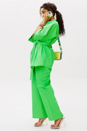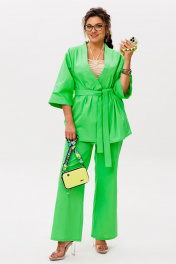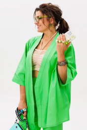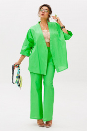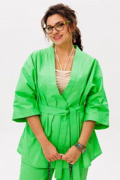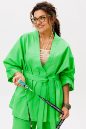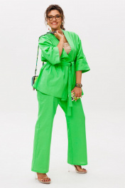 «Руккола» — цвет, который говорит сам за себя. И это не просто костюм, а готовое настроение — лёгкое, сочное, без лишних слов. Кимоно свободного кроя с фигурным запахом мягко драпируется, подчёркивая силуэт, но не сковывая его. Рукав 3/4 с широкой манжетой добавляет динамики, а отсутствие застёжек делает образ ещё более непринуждённым. Съёмный пояс позволяет варьировать степень выразительности. Брюки на резинке с расширением к низу и скрытыми карманами сохраняют баланс между комфортом и стилем. Они не утяжеляют образ, а, наоборот, придают ему лёгкую летящую пластику. Этот костюм от Анелли — про смелость, про лето, про то, как цвет может стать комплиментом всему, что вас окружает. Надеваете — и сразу чувствуете, как день становится ярче. Замеры: Размер 48: Кимоно: ОГ-122; ОБ-122; ОП-56; ДИ-72; ДР-54; Брюки: ОТ-94; ОБ-110; ДИ-107; ширина по низу - 56; Размер 50: Кимоно: ОГ-126; ОБ-126; ОП-56; ДИ-72; ДР-54; Брюки: ОТ-98; ОБ-114; ДИ-108; ширина по низу - 56; Размер 52: Кимоно: ОГ-130; ОБ-130; ОП-56; ДИ-72; ДР-54; Брюки: ОТ-100; ОБ-118; ДИ-108; ширина по низу - 57; Размер 54: Кимоно: ОГ-134; ОБ-134; ОП-56; ДИ-72; ДР-54; Брюки: ОТ-102; ОБ-122; ДИ-108; ширина по низу - 58; Размер 56: Кимоно: ОГ-138; ОБ-138; ОП-56; ДИ-72; ДР-54; Брюки: ОТ-104; ОБ-126; ДИ-108; ширина по низу - 58;