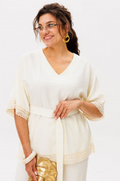Этот костюм от Анелли, словно созданный из нежнейшего ванильного облака в цвете «ванильный пломбир», дарит ощущение абсолютного комфорта и утонченной женственности. Свободная блуза с глубоким V-образным вырезом и цельнокроеными рукавами длины ¾ ниспадает мягкими складками, а изящные разрезы по бокам добавляют образу воздуха и лёгкости. Главный акцент - изысканное кружево, которым отделаны края рукавов и блуза по ниуз, превращающее простоту кроя в произведение искусства. Брюки-палаццо свободного кроя с комфортным поясом на резинке и вместительными боковыми карманами дарят свободу движений, делая этот ансамбль идеальным союзником в ежедневной городской симфонии. Вы можете подчеркнуть талию поясом, идущим в комплекте, создав более собранный и изящный силуэт, или оставить образ расслабленным, позволяя тканям струиться свободно. Носите его целиком, отправляясь на арт-бранч с подругами, в кино или на неспешную прогулку по летнему парку. А разделив костюм, вы получите две самостоятельные вещи: блузу можно сочетать с джинсами или узкой юбкой, добавив нотку романтики в повседневный лук, а брюки - с простым хлопковым топом или базовой футболкой для создания стильного и непринужденного образа на каждый день. Размер 52: Блуза: ОГ-114; ОБ-120; ОП-54; ДИ-69; ДР от горловины - 46; Брюки: ОТ-104; ОБ-116; ДИ-105; ширина по низу - 66; Размер 54: Блуза: ОГ-118; ОБ-124; ОП-56; ДИ-69; ДР от горловины - 47; Брюки: ОТ-108; ОБ-120; ДИ-105; ширина по низу - 66; Размер 56: Блуза: ОГ-122; ОБ-128; ОП-58; ДИ-70; ДР от горловины - 48; Брюки: ОТ-112; ОБ-124; ДИ-104; ширина по низу - 67; Размер 58: Блуза: ОГ-126; ОБ-132; ОП-60; ДИ-70; ДР от горловины - 48; Брюки: ОТ-116; ОБ-128; ДИ-105; ширина по низу - 67; Размер 60: Блуза: ОГ-130; ОБ-136; ОП-62; ДИ-70; ДР от горловины - 48; Брюки: ОТ-120; ОБ-132; ДИ-107; ширина по низу - 68; Размер 62: Блуза: ОГ-134; ОБ-140; ОП-64; ДИ-72; ДР от горловины - 49; Брюки: ОТ-124; ОБ-136; ДИ-107; ширина по низу - 69.