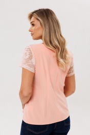 Блуза “персиковая дымка” - мягкая и утончённая модель, в которой лёгкость сочетается с аккуратной выразительностью линий. Полуприлегающий силуэт плавно подчёркивает фигуру, а фигурный подрез по переду в области талии добавляет изящества и формирует красивую, гармоничную линию. Лиф с наложением кружевного полотна создаёт романтичное настроение и делает образ особенно лёгким. Округлый вырез горловины выглядит аккуратно и мягко, а короткий втачной кружевной рукав добавляет воздушности. Спинка со средним швом и талиевыми вытачками формирует правильный силуэт, а застёжка на скрытую молнию в среднем шве остаётся почти незаметной, сохраняя чистоту линий. Слегка расширенная нижняя часть блузы придаёт образу лёгкость и баланс. Нежнейший персиковый оттенок наполняет образ свежестью и спокойной элегантностью. Эта блуза от Анелли легко вписывается в повседневный гардероб - она красиво сочетается с брюками, юбками или джинсами, создавая утончённые и романтичные образы на каждый день. Размер 46: ОГ-96; ОТ-82; ОБ-102; ОП-36; ДИ-56; ДР-17; Размер 48: ОГ-100; ОТ-86; ОБ-106; ОП-38; ДИ-56; ДР-17; Размер 50: ОГ-104; ОТ-90; ОБ-110; ОП-38; ДИ-56; ДР-18; Размер 52: ОГ-108; ОТ-94; ОБ-114; ОП-38; ДИ-57; ДР-18.