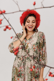 Это платье - олицетворение воздушной грации, где четкий крой встречается с игрой лёгкой ткани. Его основа - изящный А-силуэт, который рождается от завышенной линии талии. Отсюда мягкие складки шифона струятся вниз, расширяясь подобно нежному лепестку, даря фигуре и свободу, и утончённую форму. Глубокий V-образный вырез у горловины служит элегантным акцентом, вырезающим строгий и женственный контур. Рукава, укороченные до трёх четвертей, приобретают особую выразительность: мягко расширяясь от локтя, они завершаются нежным сбором на тонкой резинке, создавая у запястья лёгкий, поэтичный объём, который трепещет при каждом движении руки. Всю эту лёгкость мудро собирает и укрощает скрытая кулиска, позволяя идеально обозначить линию талии, в то время как подкладка бережно скрывает прозрачность шифона, оставляя лишь игру фактуры и цвета. А венчает образ волан, бегущий по всему низу подола. Он не просто окаймляет платье от Анелли - он приводит его в движение, заставляя край колыхаться собственной, едва слышной волной. Это платье в цвете «кремовая виола» для дня, когда хочется чувствовать себя прекрасной без всякого повода - и для того случая, когда повод требует безупречности. Размер 50: ОГ-107; ОБ-127; ОП-44; ДИ-118; ДР-45; Размер 52: ОГ-112; ОБ-132; ОП-44; ДИ-118; ДР-45; Размер 54: ОГ-117; ОБ-137; ОП-46; ДИ-118; ДР-45; Размер 56: ОГ-122; ОБ-142; ОП-48; ДИ-118; ДР-45; Размер 58: ОГ-127; ОБ-147; ОП-48; ДИ-119; ДР-45; Размер 60: ОГ-132; ОБ-152; ОП-48; ДИ-120; ДР-45.