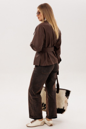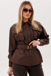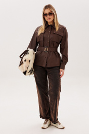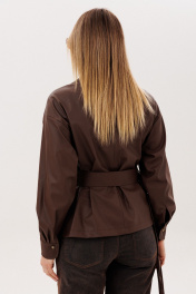 Рубашка от Анелли «чокалэйт скин» - это баланс уверенности, мягкости и современной женственности. Свободный крой создаёт ощущение лёгкости и комфорта, позволяя двигаться свободно и непринуждённо, а отложной воротник на стойке добавляет образу аккуратную, собранную элегантность. Мягкая эко кожа красиво держит форму, придаёт образу характер, оставаясь при этом практичной для повседневной жизни. Длинный втачной рукав на манжете подчёркивает изящность линий, а застёжка-планка на пуговицах добавляет классическую нотку, которая делает модель универсальной и легко сочетаемой. Два накладных кармана с клапанами создают стильный акцент и придают рубашке современное звучание, а разрезы по бокам добавляют лёгкости силуэту и красиво раскрываются в движении. Пояс из той же эко кожи позволяет менять настроение образа - носить рубашку свободно или мягко подчеркнуть талию, создавая более женственный силуэт. Эта модель легко вписывается в гардероб, прекрасно сочетается с джинсами и каблуками, создавая образ, в котором комфорт соединяется с выразительностью. Рубашка, в которой чувствуется уверенность, стиль и особое настроение. Размер 46: ОГ-104; ОТ-106; ОБ-114; ОП-46; ДИ-66; ДР-55; ШП-20; Размер 48: ОГ-108; ОТ-110; ОБ-118; ОП-48; ДИ-65; ДР-56; ШП-20.