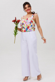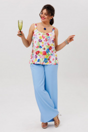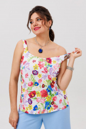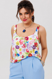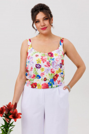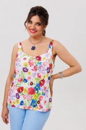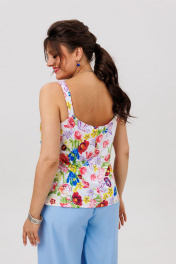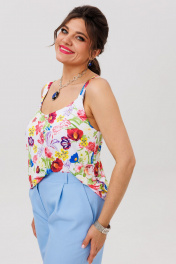 Топ в красочном цветочном принте «россыпь цветов» - лёгкий, нежный и наполненный настроением лета. Мягкая ткань с приятной фактурой деликатно струится, создавая ощущение лёгкости и естественной женственности. Яркий цветочный рисунок оживляет образ и добавляет ему свежести, делая топ выразительным, но при этом универсальным. Широкие лямки формируют аккуратную линию плеч и делают силуэт гармоничным и утончённым. Лаконичный крой позволяет легко заправлять топ в брюки или юбку, создавая более собранный образ, или носить свободно для расслабленного повседневного настроения. Топ от Анелли прекрасно сочетается с жакетом или кардиганом, становясь стильной базой для многослойных образов. Он легко вписывается в повседневный гардероб, позволяя создавать женственные и комфортные сочетания на каждый день - мягкие, красивые и наполненные лёгкостью. На модели голубые брюки 1702.1 и белые брюки 1416.1. Размер 54: ОГ-108; ОТ-110; ОБ-118; ДИ-39; Размер 56: ОГ-112; ОТ-114; ОБ-122; ДИ-39; Размер 58: ОГ-116; ОТ-120; ОБ-126; ДИ-39.
