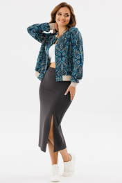 Модный трикотажный комплект-двойка в стиле спорт-шик состоит из жакета-бомбера и прямой юбки. Комплект будет уместен как для повседневной носки, так и для работы. В нем Вы будете чувствовать себя комфортно и привлекательно. Комплект можно носить вместе или комбинировать элементы с другой одеждой. Бомбер из мягкой хлопчатобумажного трикотажа прямого силуэта, с притачной манжетой понизу, без подкладки. Горловина округлая с втачной стойкой. По переду центральная застежка на кнопки и наклонные прорезные карманы с листочкой. Рукава длинные втачные, со спущенной линией плеча, понизу - на манжете. Воротник-стойка, манжеты по низу рукава и по низу жакета из трикотажного довяза. Юбка из трикотажного полотна прямая, зауженная книзу, длиной миди, с высокой посадкой, с поясом из эластичной тесьмы. На переднем полотнище разрез в вертикальном шве. Длина жакета: 60 см Длина рукава: 61 см Длина юбки (с поясом): 85 см