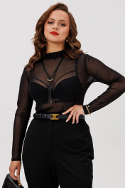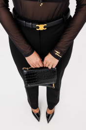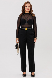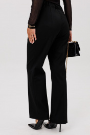 Брюки умеренного объема, прямого силуэта, с заутюженными стрелками. На задних половинках талиевые вытачки. На правой задней половинке декоративный карман с листочкой. На передних половинках вытачки. На передних половинках брюк функциональные карманы с отрезным бочком. Пояс отрезной, притачной. На поясе шлевки. Пояс расположен на уровне линии талии. Застежка брюк – классический гульфик. Застежка пояса петля и пуговица. Длина брюк по боковому шву с шириной пояса 109 см, рост модели на фото 170см.