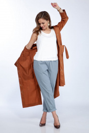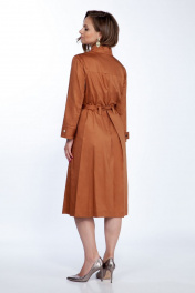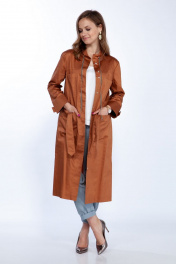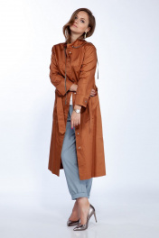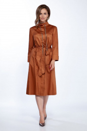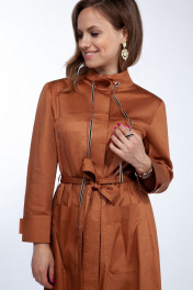 Платье-плащ из хлопчатобумажной ткани, прямого силуэта. Перед с кокеткой. По линии груди и бедер, настрочены накладные карманы. Изделия на потайной планке на кнопки. В боковых швах шлицы. Спина с кокеткой и бантовой складкой. На горловине пробиты люверсы, через которые пропущена декоративная тесьма. Рукав втачной, 3/4. По низу рукава манжета, с закрепленной на кнопку декоративной патой. По линии талии настрочены шлевки. Изделие дополнено съемным поясом. Длина изделия - 110 см, Длина рукава - 53 см.