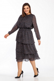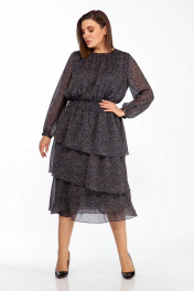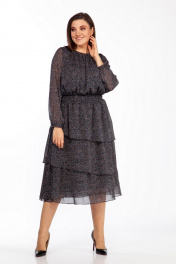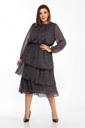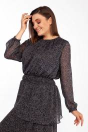 Платье женское полуприлегающего силуэта отрезное по линии талии, со съёмным воротником. Воротник с рюшами. По обтачке горловины, низу лифа платья, верху юбки и воланов платья, а также низу рукавов - сборка. Спинка с разрезом в среднем шве сверху, застёгивающимся на втачную петлю и пуговицу. Сборка по втачному поясу - эластичная тесьма «венгерка». Юбка платья состоит из четырёх воланов, притачаных по отдельности к подкладке. Рукава длинные, одношовные, с окантованным разрезом «капелька» и притачными манжетами, которые застёгиваются на одну обмётанную петлю и пуговицу.