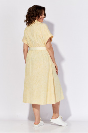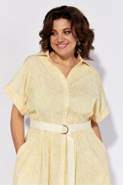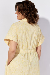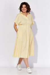 Платье женское полуприлегающего силуэта из хлопковой ткани. Платье с центральной застежкой на петли пуговицы. Детали переда с декоративными защипами по линии талии. Спинка с кулисой по линии талии, в которую вставлена эластичная тесьма. В боковых швах обработанные карманы рукав цельнокроеный. Рукав с отрезной манжетой. Воротник рубашечного типа. Длина изделия в базовом размере по спинке-117 см.