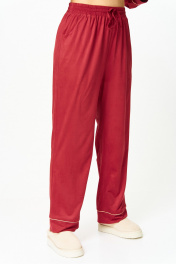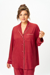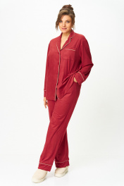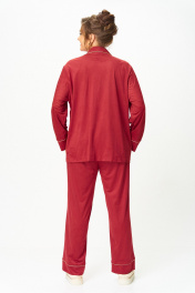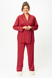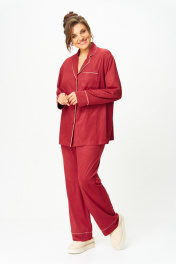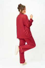 Костюм женский из текстильного полотна состоящий из жакета и брюк . Жакет без подкладки прямого силуэта на центральную застежку на петли и пуговицы, воротник пиджачного типа. Брюки с высокой посадкой на резинке с боковыми карманами.