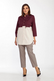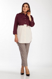 Удлиненная блуза свободного кроя с фигурным низом. Застежка по центру переда на пуговицы. Застежка на пуговицы по боковым швам дает возможность вправлять в брюки одну полочку. На кокетке нагрудные карманы. Блуза выполнена из двух видов хлопковой ткани устойчивой окраски. Комплектуется съемным украшением корабль. Длина изделия по спинке - 87 см. Длина изделия по переду - 77 см. Длина рукава от горловины - 64 см.