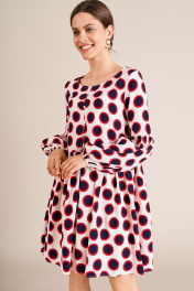 Платье женское из плательной ткани, отрезное по линии талии, свободного кроя, на подкладке. Юбка по линии талии со сборкой. Горловина на окантовке. Рукав втачной со сборкой , низ рукава на резинке. По переду изделия декоративные пуговицы (имитация застежки). Длина изделия 83 см, длина рукава 61,5 см.