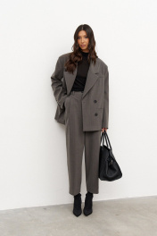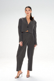 Брюки прямого свободного кроя выполнены из полотна серого цвета в тонкую полоску. Характеристики: прямой крой, стабильный пояс, в боковых швах караманы, складки по переду изделия. Длина по боковому шву 104 см