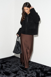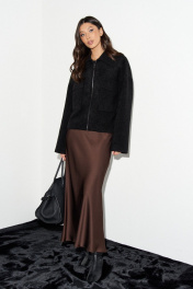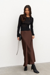 Юбка полуприлегающего силуэта выполнена из струящегося полотна шоколадного цвета. Характеристики: полуприлегающий силуэт, подкладка, пояс на резинке. Длина по боковому шву 98 см.