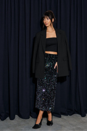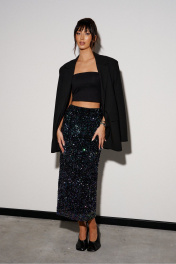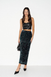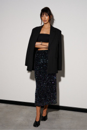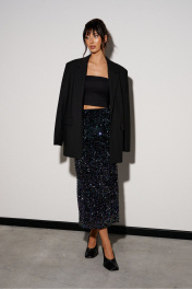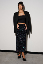 Юбка прямого кроя выполнена из полотна с пайетками. Характеристики: прямой крой, подкладка, пояс на резинке. Длина 88 см.