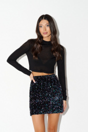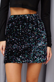 Юбка прямого кроя выполнена из полотна с пайетками. Характеристики: прямой крой, подкладка, пояс на резинке. Длина 41 см.