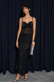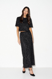 Юбка прямого кроя выполнена из черного ворсистого полотна с пайетками. Характеристики: прямой крой, подкладка, пояс на резинке, в среднем шве заднего полотна изделия разрез 51 см. Длина изделия 92 см.