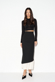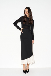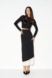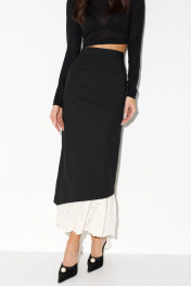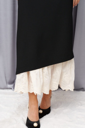 Юбка прямого кроя выполнена из полотна черного цвета. Характеристики: прямой крой, стабильный пояс, подклад, по переду и спинке от пояса по четрые выточки, в среднем шве заднего полотна изделия застежка-потайная молния, по центральному шву заднего полотна разрез основной ткани, низ платья в основной ткани скошен и украшен декаратичной строчкой, имитация подъюбника из молочной ткани с вышивкой. Длина изделия по боковому шву 97 см, длина разреза по заднему центральному шву 50см.