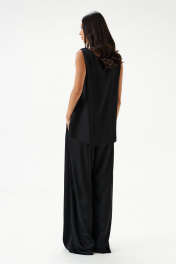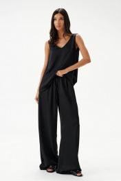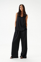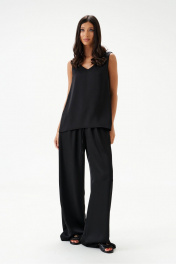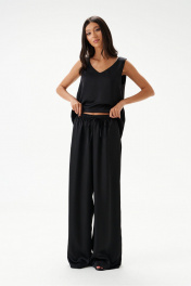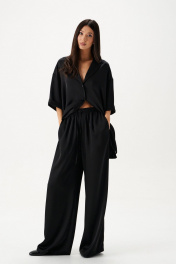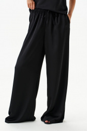 Брюки выполнены из струящейся ткани, черного цвета.Характеристики: прямой свободный крой, пояс на кулиске, в боковых швах карманы. Длина брюк по боковому шву 111 см.
