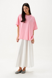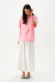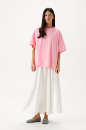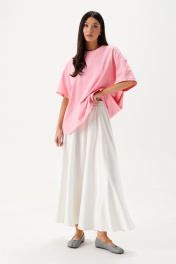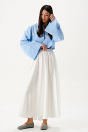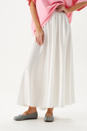 Юбка кроя полусолнце, выполнена из ткани белого цвета.Характеристики: крой полусолнце, без подкладки, по бокам и сзади изделия шов, пояс на резинке со сборкой. Длина юбки 93 см.