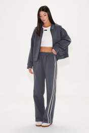 Брюки выполнены из трикотажного полотна серого цвета. Брюки свободного кроя, пояс брюк на резинке, в боковых швах карманы. По боковым швам изделия встрочен декоротивный элемент в виде лампасов. Длина по боковому шву 102 см.