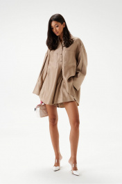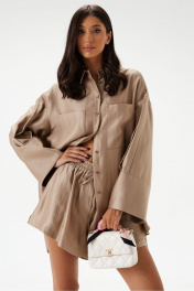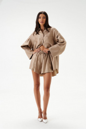 Шорты свободного кроя. Выполнены из текстильного полотна. Характеристики: пояс на резинке с кулиской, карманы-хулиганы, по передней и задней части вертикальные швы, в боковых швах разрезы 4см. Длина изделия по боковому шву 35 см.