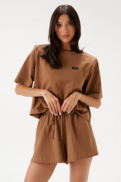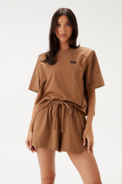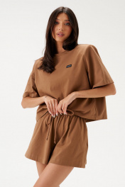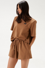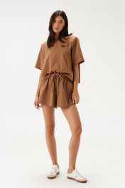 Шорты свободного кроя, выполнены из трикотажного полотна.Характеристики: прямой крой, пояс на резинке, завязка декоративная, в боковых швах карманы. Длина 34 см.