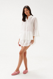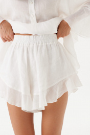 Шорты свободного кроя, выполнены из лёгкого натурального полотна белого цвета – рами.Пояс на резинке, есть подкладка, по низу шорт нашита рюша из ткани основного изделия. Длина по боковому шву с учетом рюши - 32 см