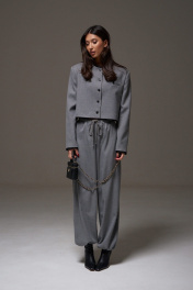 Брюки-джоггеры. Выполнены из мягкого текстильного полотна цвета серый меланж. Характеристики: прямой крой, пояс на резинке, в боковых швах карманы, штанина внизу на резинке с фиксатором. Длина 107 см.