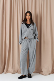 Брюки-джоггеры. Выполнены из полотна штуркса серого цвета. Характеристики: прямой крой, пояс на резинке с кулиской, в боковых швах карманы, накладные карманы на задней части брюк, штанина внизу на резинке с фиксатором. Длина по боковому шву 106 см.