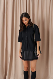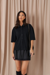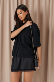 Юбка полуприлегающего силуэта выполнена из струящегося полотна черного цвета на брендированной подкладе. Характеристики: полуприлегающий силуэт, пояс на резинке, по низу изделия пришито кружево. Длина по боковому шву 40 см.