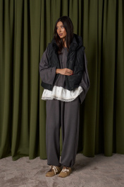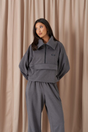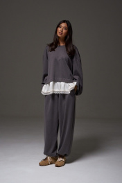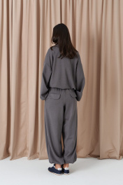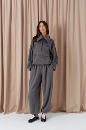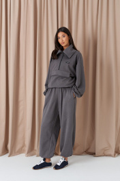 Брюки-джоггеры. Выполнены из мягкого текстильного ворсистого полотна графитового цвета. Характеристики: прямой крой, пояс на резинке, в боковых швах карманы, на задней части изделия имитация накладных карманов, штанина внизу на резинке с фиксатором. Длина 107 см.