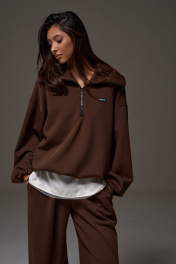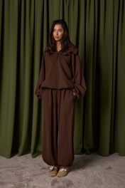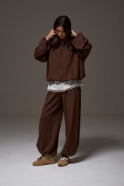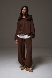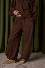 Брюки выполнены из трикотажного полотна шоколадного цвета. Характеристики: прямой крой, пояс на резинке с кулиской, в боковых швах карманы, накладные карманы на задней части брюк, штанина внизу на резинке с фиксатором. Длина по боковому шву 104 см.