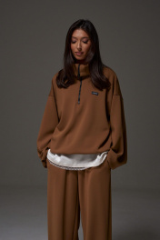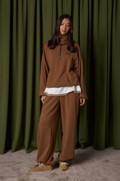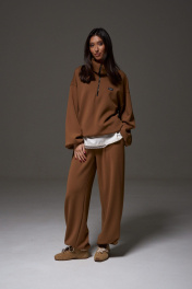 Брюки выполнены из трикотажного полотна кофейного цвета. Характеристики: прямой крой, пояс на резинке с кулиской, в боковых швах карманы, накладные карманы на задней части брюк, штанина внизу на резинке с фиксатором. Длина по боковому шву 104 см.