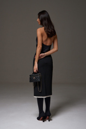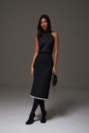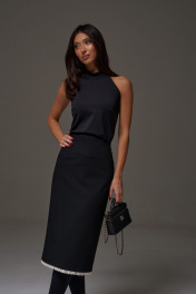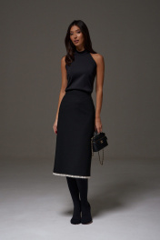 Юбка-миди полуприлегающего силуэта, выполнена из костюмной ткани черного цвета. Характеристика: прямой крой, пояс стабильный, подкладка, застёжка потайная тесьма молния в среднем шве со спины, в среднем шве заднего полотна изделия разрез 26 см. Длина юбки по боковому шву 75 см.